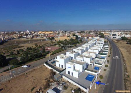 Miniprosjekt i San Pedro del Pinatar med kun tre eneboliger. 174 m2 fordelt på to etasjer, 3 sov/3 bad. Lettstelt tomt, 200 m2. Privat basseng, biloppstillingsplass og 49 m2 takterrasse. Pris 479.900€ + omk. Ferdigstillelse: Juni 2026
