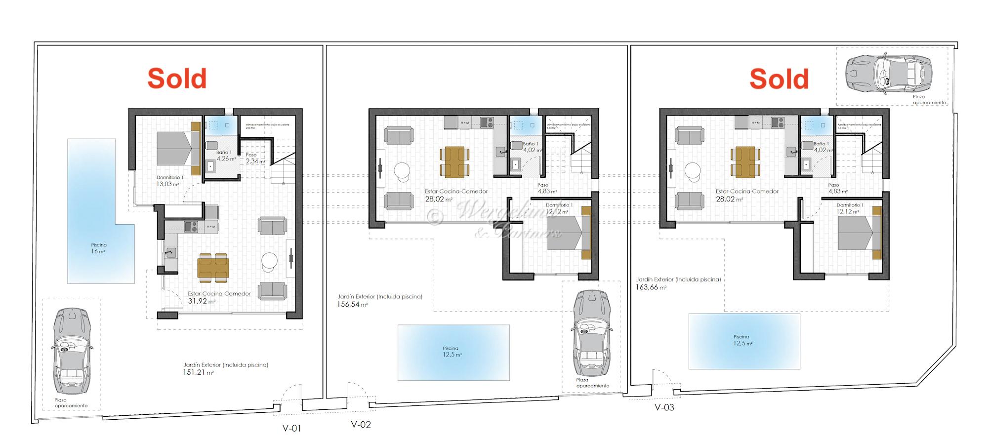 Horadada Parquea Margove er et miniprosjekt med 3 eneboliger som bygges kun 500 m. fra stranden i meget populære Torre de la Horadada. Denne boligen er på 140 m2 på 221 m2 tomt. 3 soverom og 3 bad fordelt på to etasjer, pluss en 44 m2 stor takterrasse.